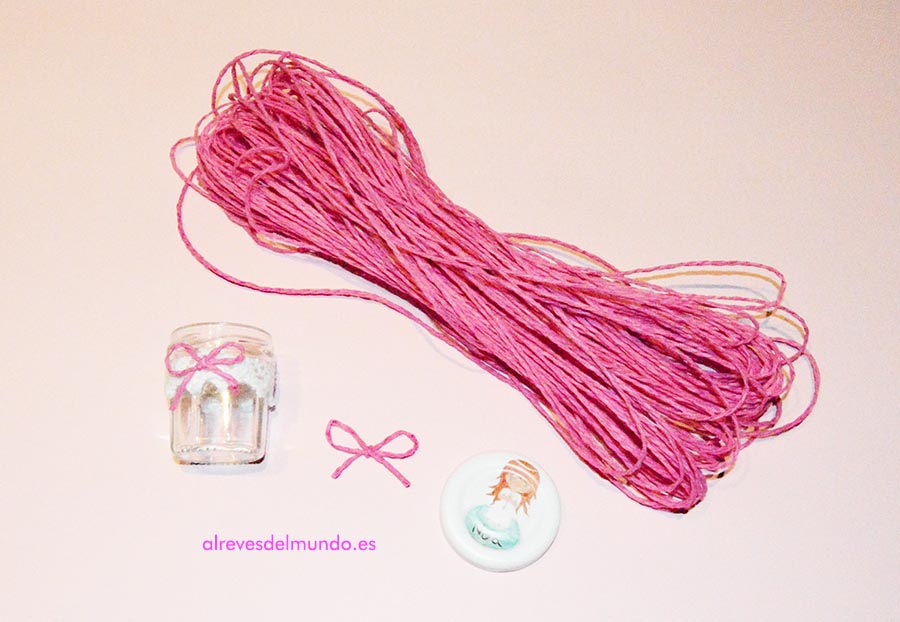 - A continuación para que no se viera el remate, pusimos un lacito de cuerda color fucsia (como no...)