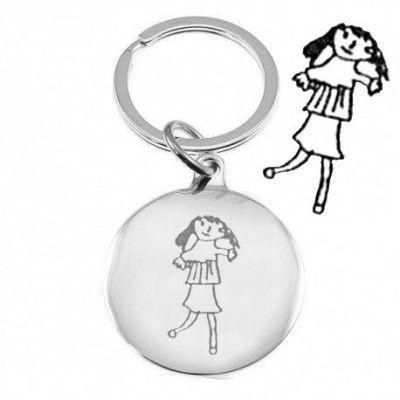 Pide a tu hijo que realice un dibujo de su profesor. En esta Tienda on line de grabado láser puedes grabar el dibujo en llaveros de metacrilato, madera o acero.