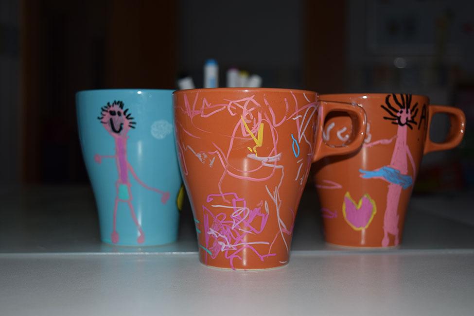 Para hacer las tazas nosotros hemos probado varias formas. Os lo contábamos en este post, pero después de varias pruebas, nos quedamos con la opción de dibujar sobre la porcelana con rotuladores de porcelana de la marca Edding, que se compran en Amazon muy fácilmente, y que después de horneados, pueden ser lavados incluso en el lavavajillas.