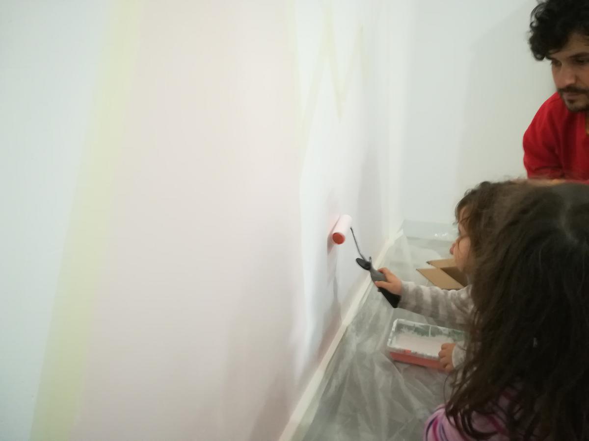 Forramos bien todo el suelo por miedo a que el suelo pudiera mancharse con la pintura y…¡manos a la obra! y cuando digo manos a la obra, me refiero a que todos acabamos pintando. Las niñas fueron las primeras que querían dar algún que otro brochazo, asi que con un rodillo mediano empezamos con la tarea.
