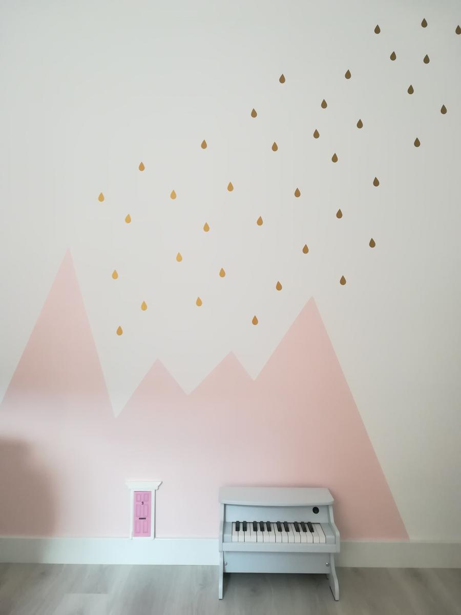 Sin embargo, desde hace ya un tiempo, teníamos ganas de dar un cambio a la habitación de las niñas y poner un toque de color a la pared que quedaba más despejada, y no dudé en ningún momento. Quería unas montañas, y nuestra “mayor” decidió que tenían que ser rosas (sí… y si la hubiéramos dejado llevarían hasta purpurina xdd).