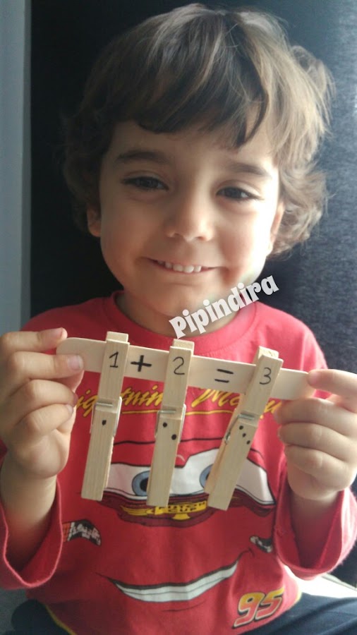 Unai (3 años) contaba los puntos que había en cada pinza y los colocaba en el palo. Una vez colocadas 2 pinzas contaba todos los puntos que había entre las 2 y buscaba una pinza que tuviera la misma cantidad de puntos. Empezamos con sumas sencillas 1+1, 1+2, 2+3 y hasta ahí ese día al día siguiente un poco más, sin agobios claro. Al principio lo ayudaba y después ya lo hacía solo y ¡qué contento se ponía cuando lo conseguía!