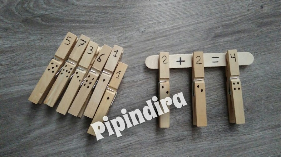 ¿Más fácil imposible verdad? Arriba escribimos los números delante y detrás de la pinza y debajo los puntos con la cantidad que representa. En el palo ponemos el símbolo + dejando espacio para poner las pinzas y el símbolo =.