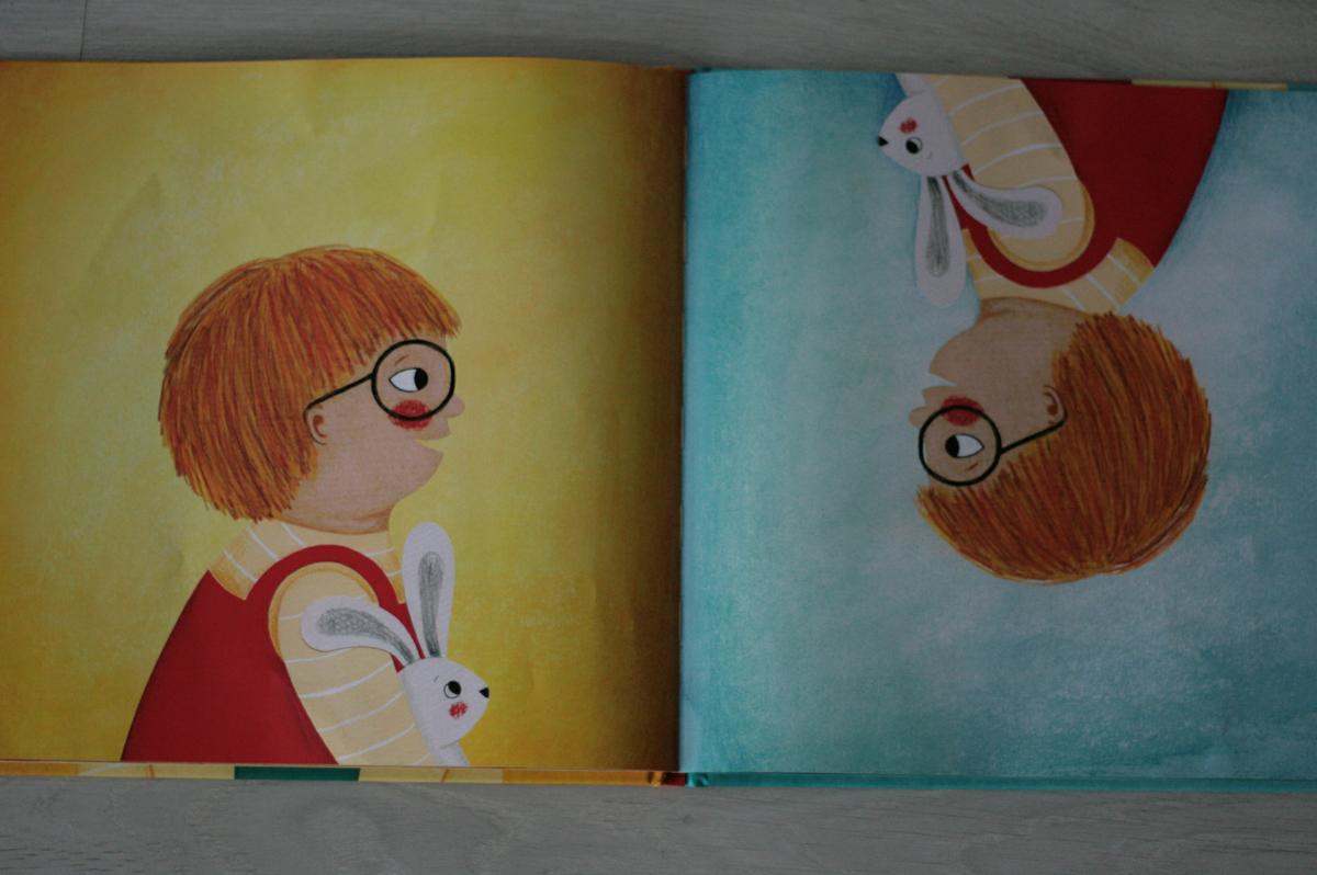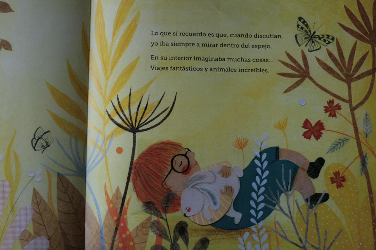Ante todo, este libro nos transmite una sensación de tranquilidad y una estructura muy clara con sus dos portadas. El libro se puede empezar tanto por un lado como por otro y ambos se unen en unas páginas en las que el niño mira a través del espejo mágico que tiene en casa de sus padres. Por eso, la separación, la estructura dividida es muy visible.