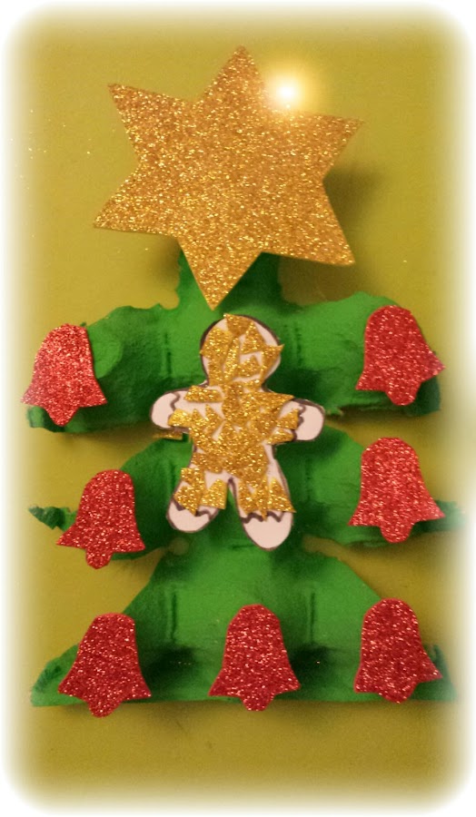 Así que nada con un cartón de huevos, lo corté haciendo como pude una forma de árbol, lo pintaron y les ayudé a recortar unos pequeños adornos con goma eva para que los pegarán.