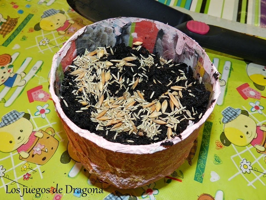 - Por último echamos tierra, semillas (hierba de gato) y un poco más de tierra. Un poquitín de agua y ¡al sol! En pocos días ya teníamos la hierbita bien crecidita.