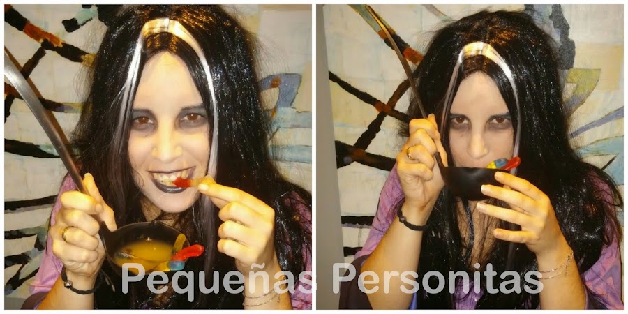 En cuanto al menú... me explico... soy muy rara y asquerosa con la comida, incluso con los postres. No me gustan los huesos de santo, ni los panellets ni nada típico que se me pueda ocurrir para estas fechas. Así que he optado por llenar el caldero con zumo de piña y añadir unas chuches. Ya lo hicimos el año pasado y está para chuparse los dedos.