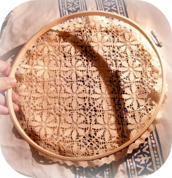 Mi suegra tenía varios paños de ganchillo unos y de bolillos otros, no cuadraban con la decoración de mi casa, pero con el tiempo he aprendido a valorar el trabajo del ganchillo y me daba mucha pena tirarlos. Así que quedaron en el cajón para sacarle partido en algún momento. Pensé utilizarlos para personalizar algún pantalón o camiseta, pero de momento no había encontrado donde colocarlos.