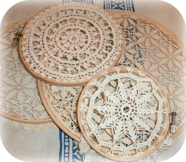 Ahora sólo te queda colgarlos y disfrutar de tu creación, cuando te canses con aflojar el bastidor y colocar dentro otra decoración será suficiente. Además con esta manera de colocar el tapete no se estropea, por lo que lo tendrás intacto para cuando se vuelvan a llevar colocados sobre las mesas.
