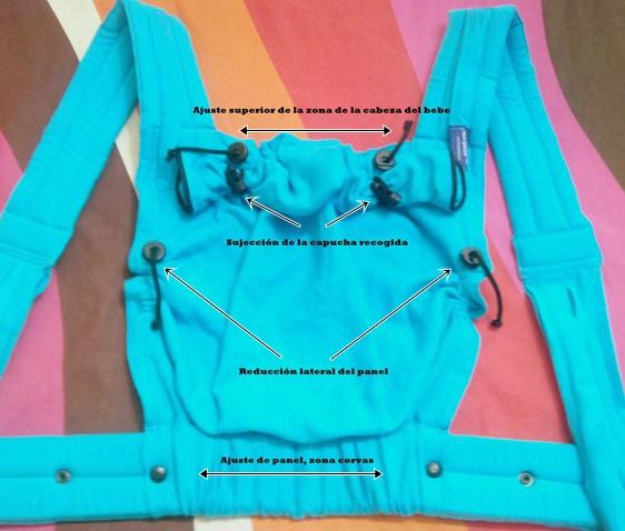 Un tip importante que me gusta de este mei tai evolutivo es que se puede ajustar tanto en la zona de corvas, como lateral y la zona superior (donde ajustamos para sujetar la cabecita del bebe) como podeis ver en esta foto