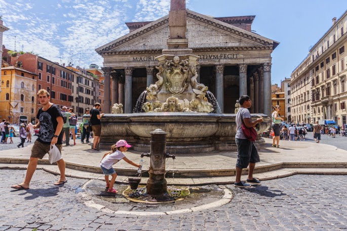El agua de Roma es de una calidad excelente. Los romanos han tenido siempre una gran pasión por las aguas públicas. Hay infinidad de fuentes repartidas por toda la ciudad, donde los niños pueden llenar sus botellas, refrescarse, y en algunas, como las de la Piazza del Popolo, incluso sumergir los pies.