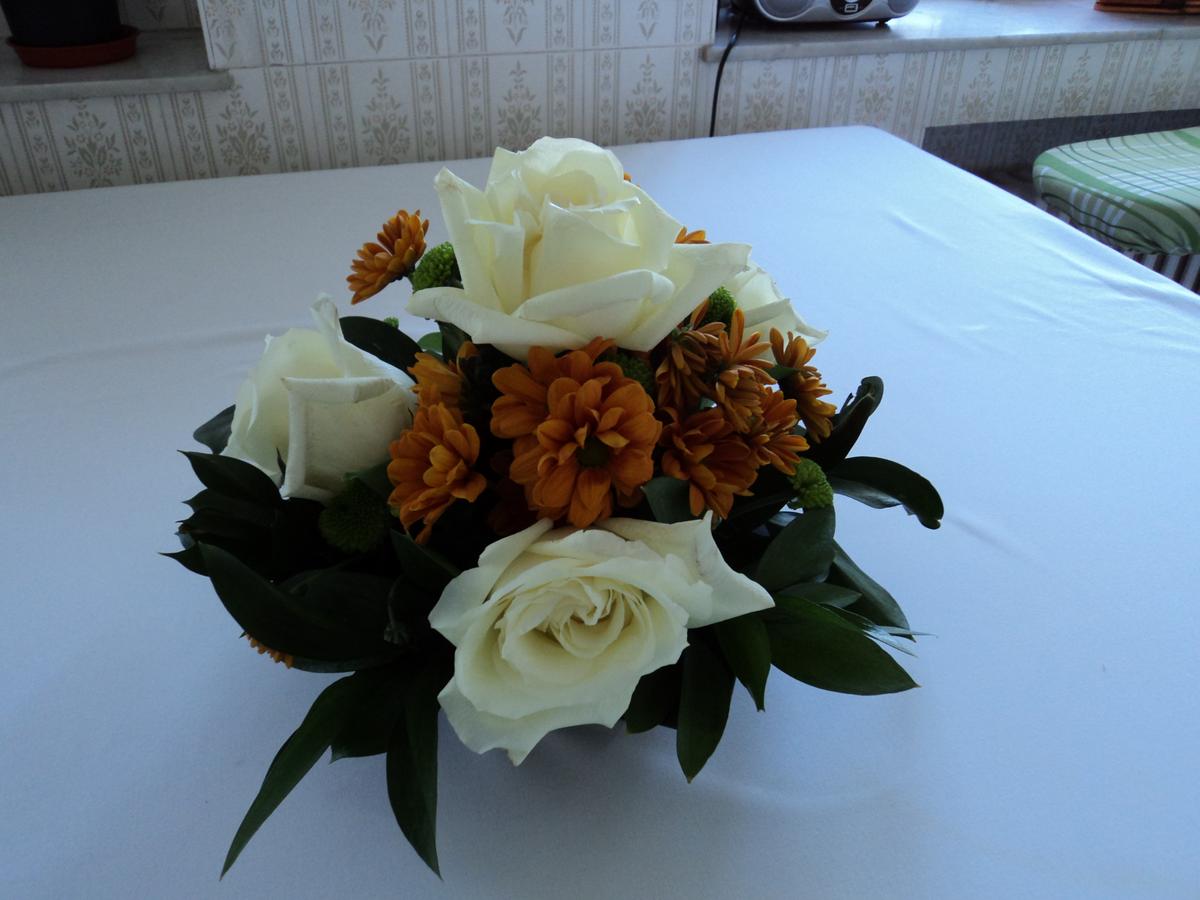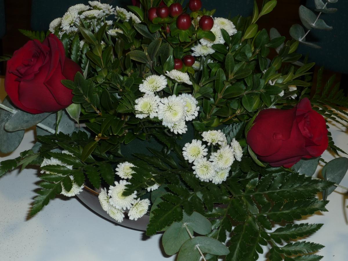 Aquí están con margaritas blancas y unas bolitas granates que no sé cómo se llaman.