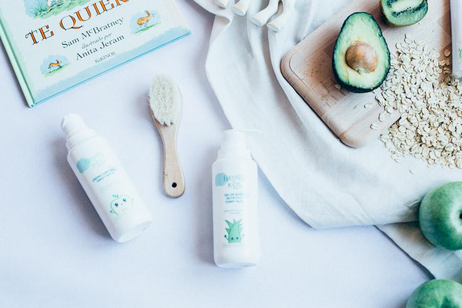 La enjabono suavemente con los productos que estoy utilizando ahora de la línea Freshly KIDS que es una cosmética natural infantil que va desde 0 a 3 años. Utilizan fórmulas muy suaves y agradables, y altamente saludables evitando el uso de cualquier ingrediente agresivo que pueda dañar su dermis. Utilizo el champú con Kiwi, Aloe Vera y Agua de Arroz y su gel que contiene aceite de algodón, avena, manzana y aloe vera que nutre, protege y mejora la piel del bebé.