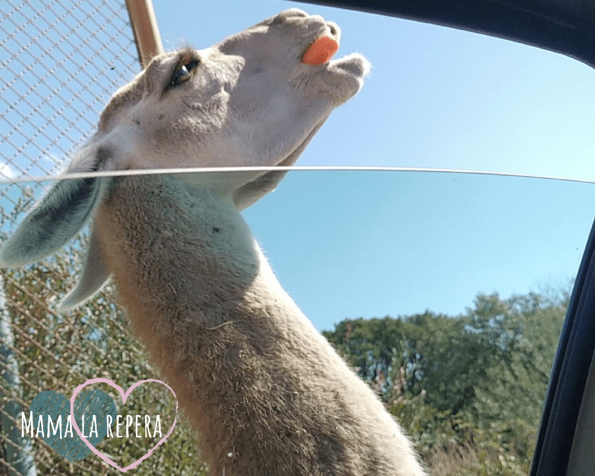 El recinto se divide por fases, en la primera de ellas es donde podrás bajar unos 10cm las ventanillas del coche para ofrecer zanahorias a las llamas, antílopes o ciervos entre otros. En principio estas especies de animale no suelen morder o por lo menos no es lo habitual. Y si te atreves, mientras les das de comer también podrás acariciarlos con sumo cuidado eso si.En la segunda fase, no se recomienda bajar las ventanillas del coche porque algunas especies como las cebras podrían darte un pequeño mordisco y otras como las cabras, se te subirán al vehículo y te irás con un buen arañazo de recuerdo. Aún así, nosotros las abrimos en nuestra primera visita…y se nos metió un camello por la ventanilla que no sabíamos como sacarlo de ahí. También veréis avestruces junto a otros mamíferos.