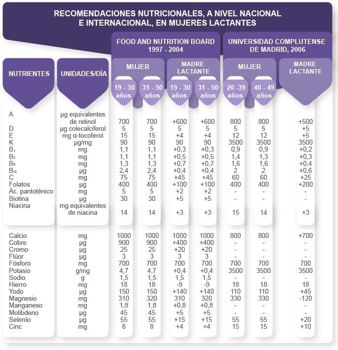 Las mujeres lactantes producen entre 500 y 700 ml de leche al día, con un elevado valor energético y rico contenido en micronutrientes, por lo que tienen mayores requerimientos de energía que las mujeres no lactantes. El consumo de proteínas es fundamental en este período y “al menos el 50% de las proteínas deben ser de alto valor biológico: señala Carolina Muro. Además, se recomienda consumir entre un 30-35% de lípidos, principalmente aquellos que provienen del pescado azul, ya que los lactantes consiguen mejores resultados en las pruebas de evaluación neurológica. Los hidratos de carbono también son fundamentales en esta etapa pero se puede mantener el mismo porcentaje que las mujeres no lactantes. “Los hidratos de carbono deber aportar entre un 50-55% de las Kcal totales ingeridas”, explica la experta. Además recuerda que “durante la lactancia los micronutrientes como el hierro, el calcio y el yodo son fundamentales”