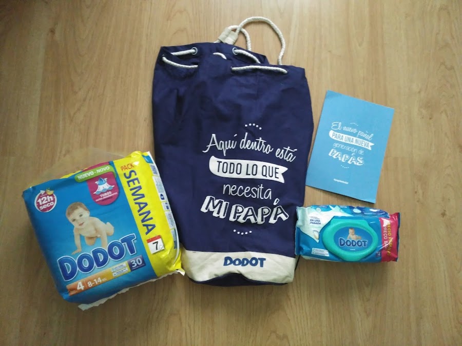 Para empezar nos llegó un pack formado por un paquete para una semana del nuevo Dodot azul talla 4, la que usa nuestro peque, un paquete de toallitas Dodot azul y una mochila super molona :)