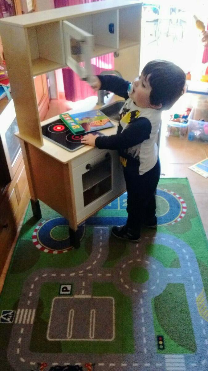 Por lo menos me puedo quedar con mi mami en casa, jugando con mi nueva cocina, que me han regalado por mi cumple. Hago unos perritos calientes y unos lenguados a la plancha buenísimos!!!