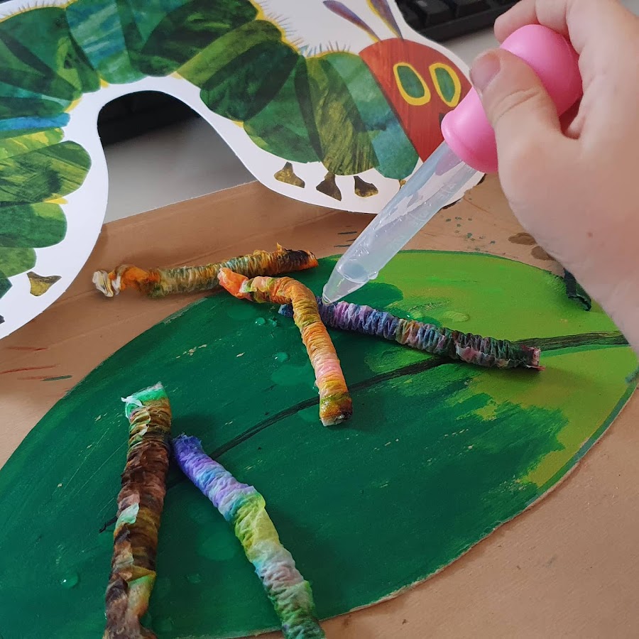 Necesitáis papel de cocina, rotuladores, pegamento y agua. Luego la base donde queráis poner vuestras orugas que se mueven, la elegís vosotros.