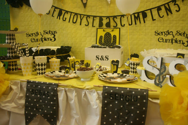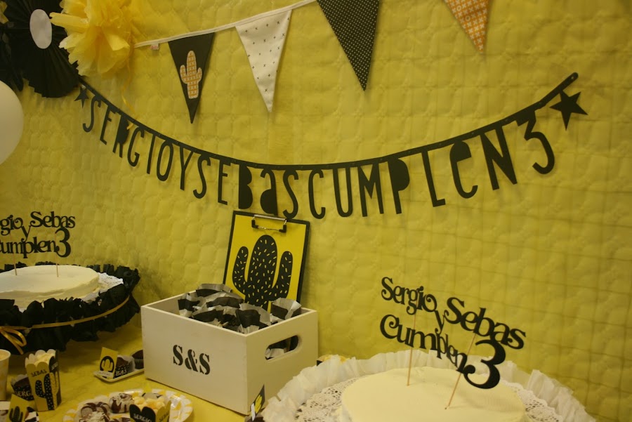 Me encanto la idea de colocar esta guirnalda de letras con la frase "Sergio y Sebas cumplen 3" en la trasera amarilla porque destaca mucho más, la guirnalda es de @fiestascoquetas