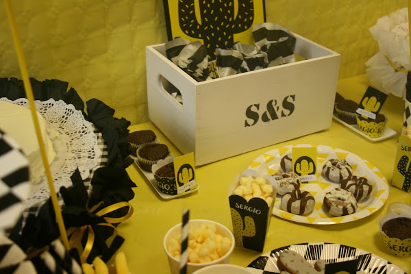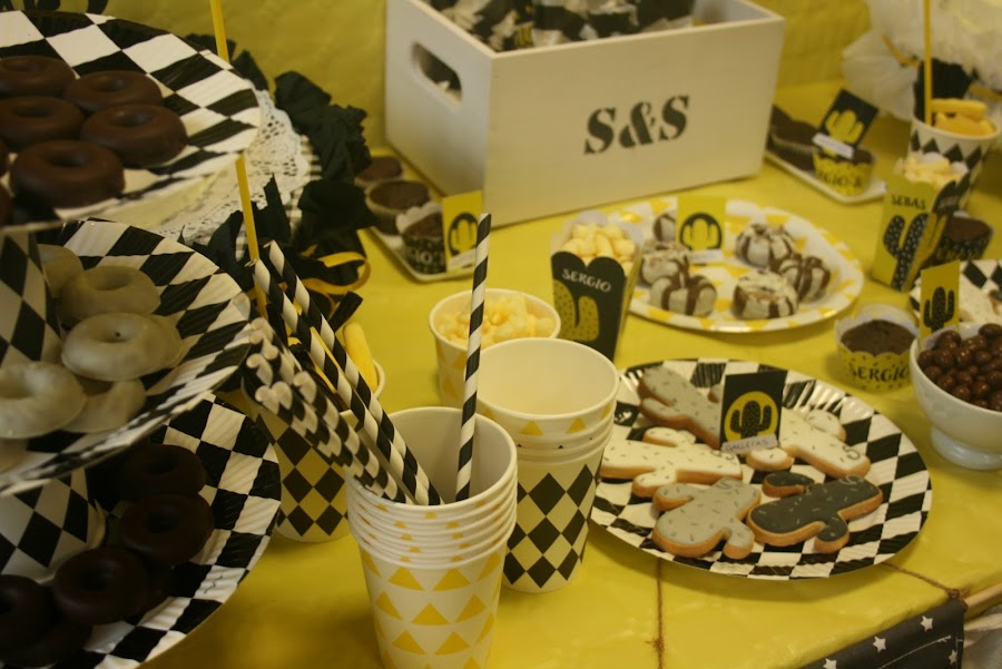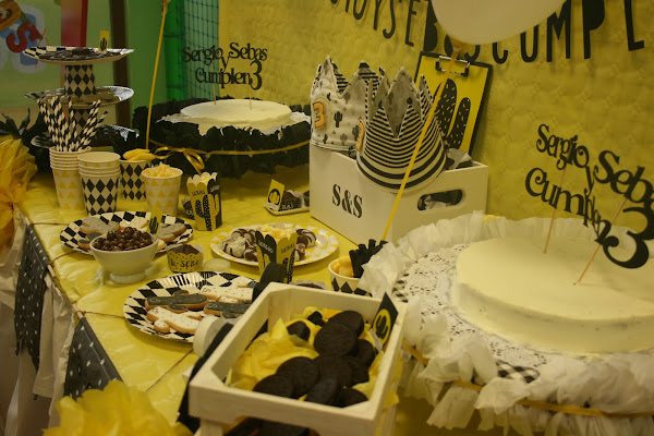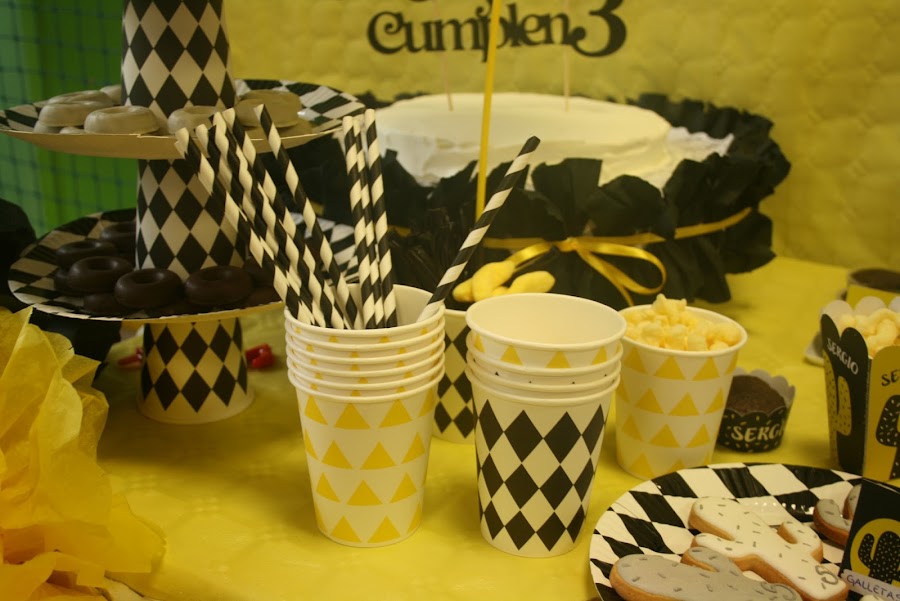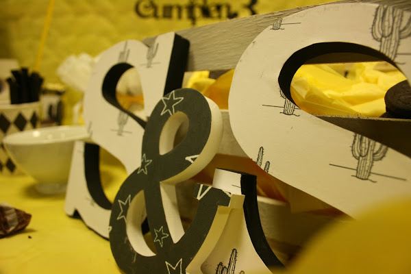 Posteriormente empecé la búsqueda de vasos, platos y todo el menaje en esos dos colores, y por suerte me tope con Fiestas coquetas, además de encontrar todo lo que necesitaba, me asesoraron un montón en cuanto a la decoración y me aconsejaron incorporar el amarillo para dar un toque de luz (pilláis como la bola va creciendo cada vez más ¿no?) pues me gustó la idea y decidí hacerles caso, pero como veréis, la situación se me fue de las manos y lo que iba a ser blanco y negro con un toque de amarillo, terminó siendo amarillo con toques de blanco y negro, pero oye, yo encantada.