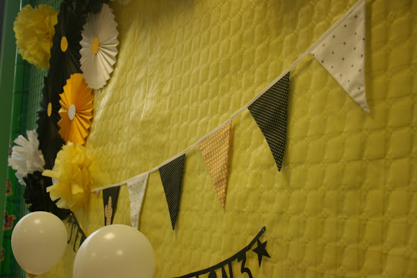 Para decorar el fondo conseguí dos rollos de papel amarillo (de estos típicos de mantelería, pero de los fuertes) y llenarlo de pompones y abanicos, que si buscáis tutoriales en Pinterest hay tropecientos, y los dispuse en el momento y a ojo, dejando sitio para las guirnaldas que quería poner.