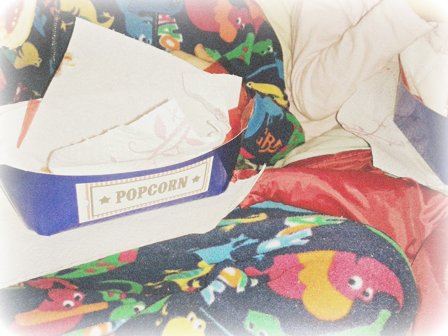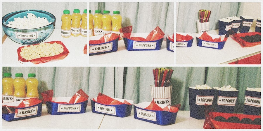 Para picar: palomitas, por supuesto, en sus vasos de cartón, eso ya les pareció que era divertidísimo. Puse también unos chaskis, un guiño a mi príncipe, porque era lo que nos tomábamos cuando no teníamos hijos y podíamos ir al cine ¿te acuerdas?