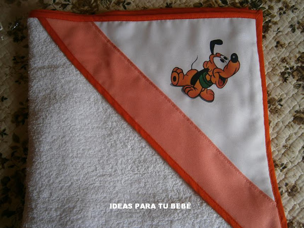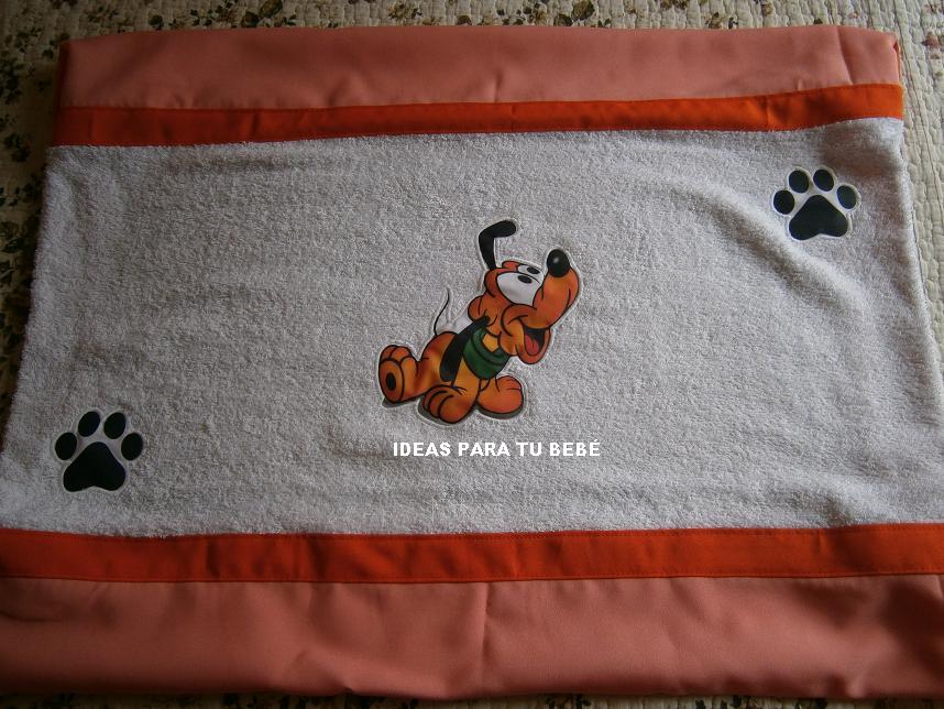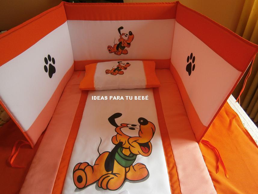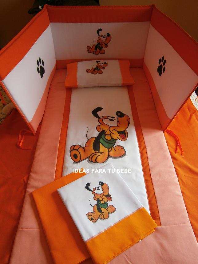 Este es un avance del pedido de Tamara, del set de cuna de pluto bebé. Los colores que se utilizan son naranja, melón y blanco. El diseño de pluto es estampado en el centro del edredón y en el protector central cabecero. En cada protector lateral se ha colocado como decoración las huellas de pluto. También se está trabajando la capa de baño y funda de cambiador.