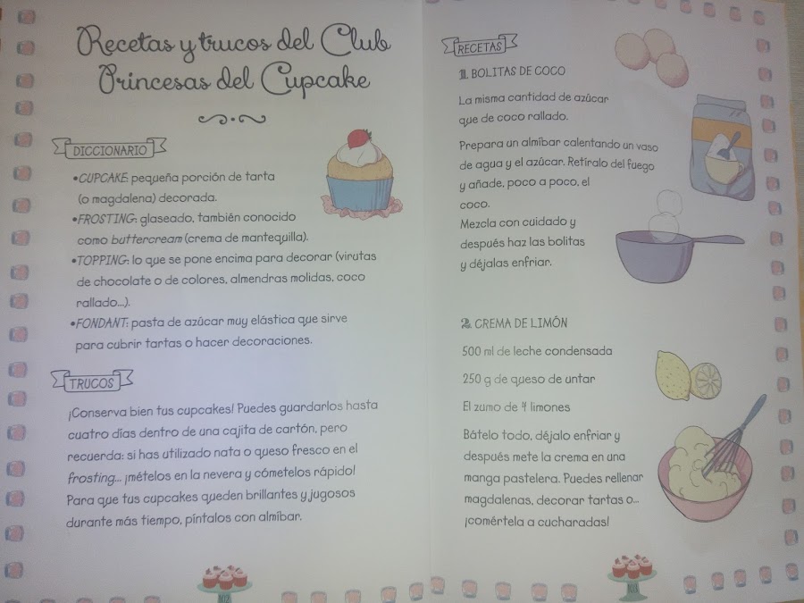 Tiene bastante vocabulario relacionado con la cocina y los postres, lo que me parece estupendo para que amplíen vocabulario. Las palabras técnicas en ingles (anglicismos) vienen al final del libro explicadas en un pequeño diccionario junto a las recetas.