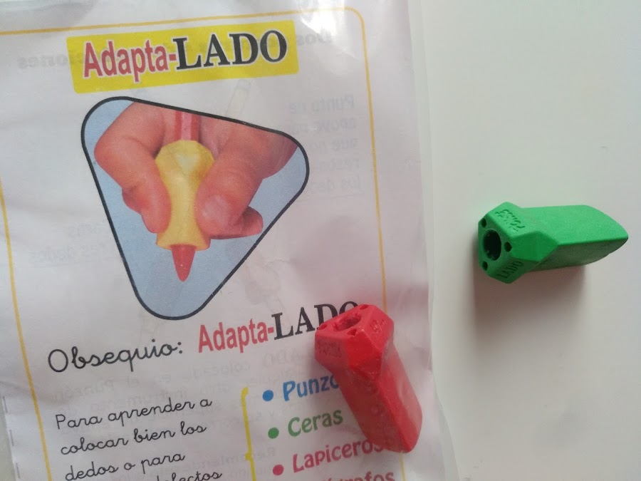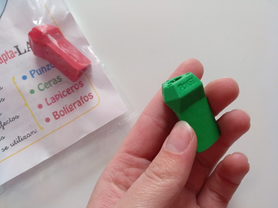 Me parece ideal para facilitar la colocación natural de los dedos sobre el lápiz, especialmente para los más pequeños. Está elaborado para poder utilizarse en: punzones, ceras, lápices y bolígrafos. Y por otro lado, ofrece dos posturas y por lo tanto dos soluciones: