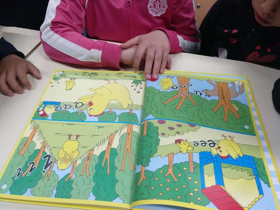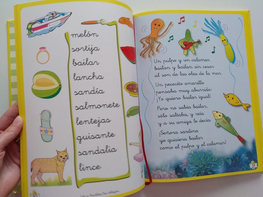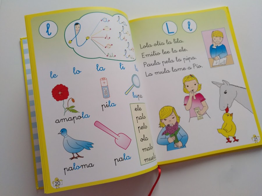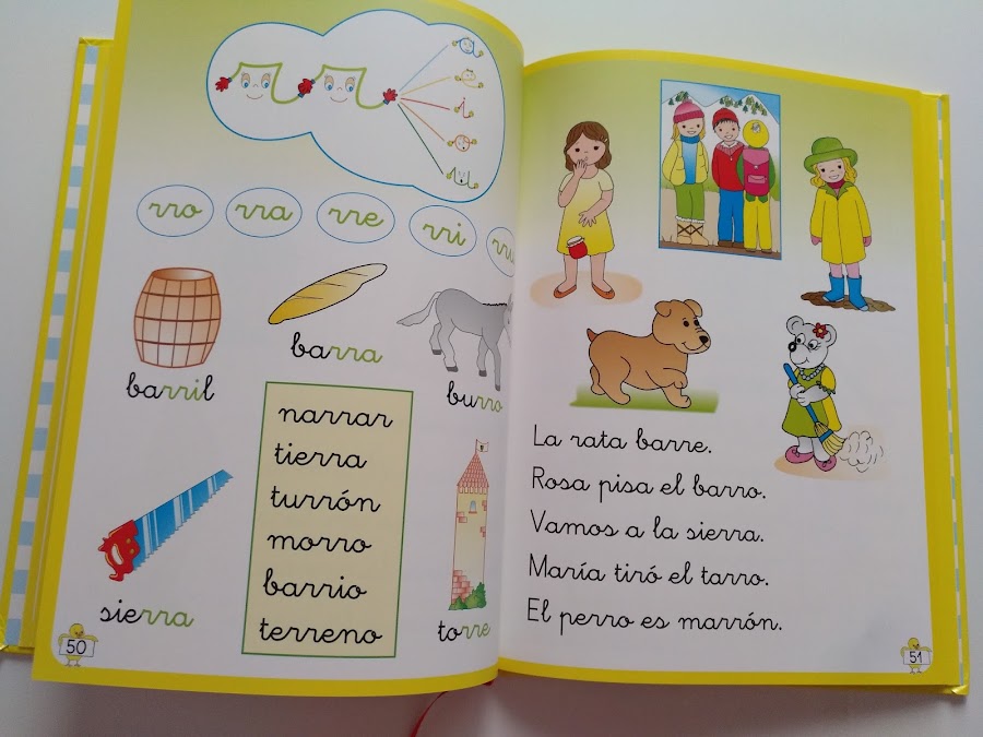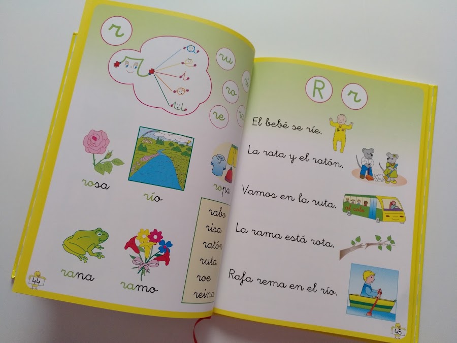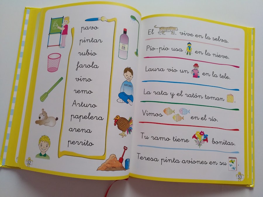 Se enseña cada letra (vocal y consonante) por su sonido, empleando la ilustración de un animal, objeto, elemento, etc. Cuyo nombre comience o contenga la letra por enseñar. Por ejemplo: para enseñar la i, encontramos dibujos de los siguientes elementos: indio, isla o iglú. Y para enseñar la r, encontramos dibujos y palabras como: rosa, rio, ropa, rana, ramo, ratón o risa.