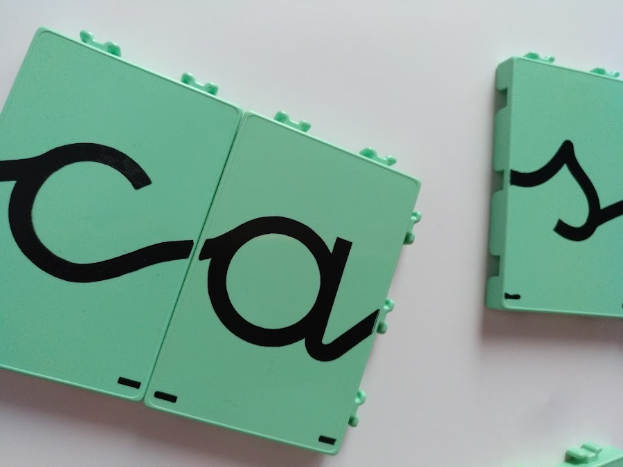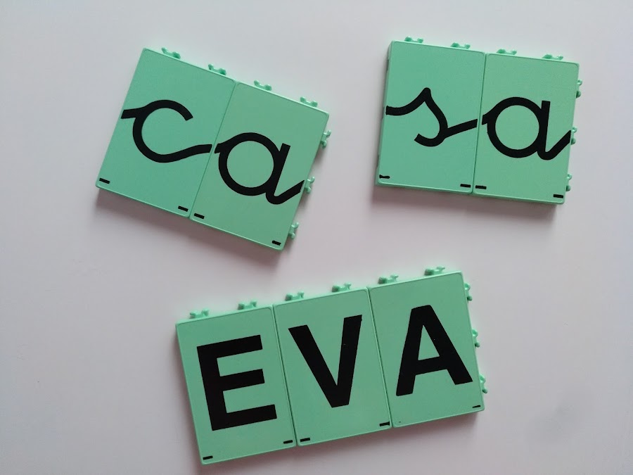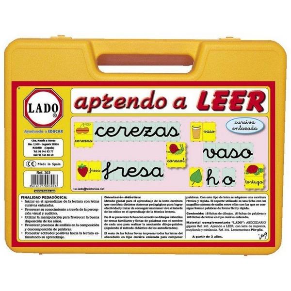 Conjunto de fichas muy resistentes y encajables entre sí en diferentes posturas. Está compuesto por 18 fichas de dibujos, 18 fichas de palabras completas (autodictado), y todas las letras del abecedario en letra cursiva enlazada (tipo montessori) la más usada en la educación española (108 en total).Es un maletín imprescindible para componer y descomponer palabras con letras que se dan la mano.