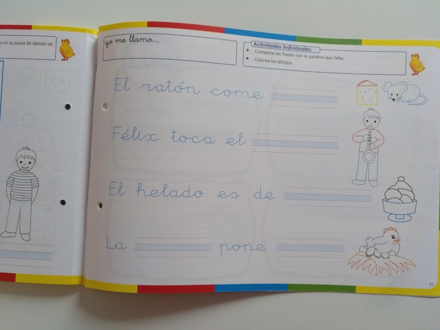 Copiar palabras, frases y oraciones que ya pueden leer y que se le presentan escritas. Por ejemplo: El guiso lleva guisantes. Así como la construcción de frases u oraciones nuevas, completándolas con palabras conocidas presentadas mediante imágenes. Por ejemplo: