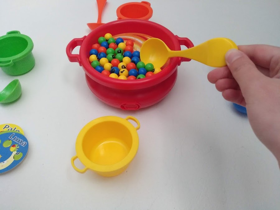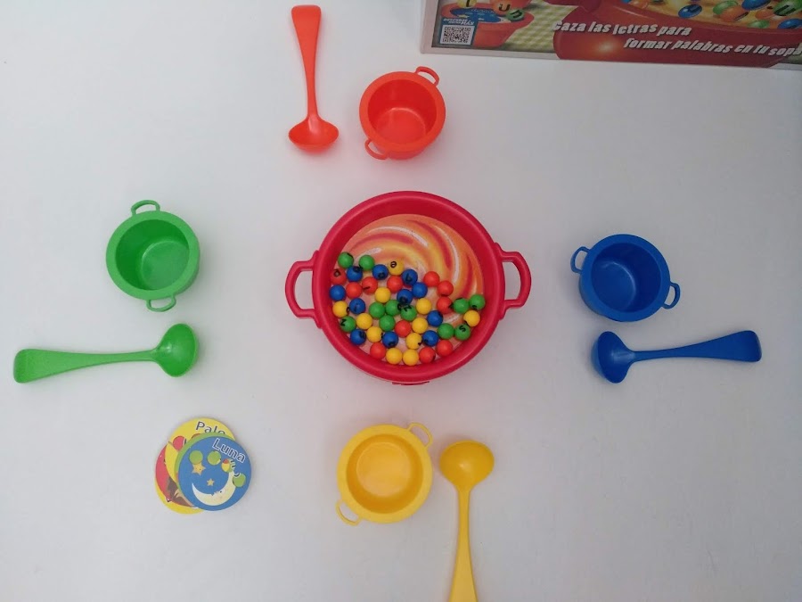 El juego consiste en intentar rellenar con las letras de la olla los huecos de las fichas que toquen. Cada ficha contiene: un dibujo, una palabra y tantos huecos como letras tiene dicha palabra. Y las bolitas que contienen las letras tienes que cogerlas con una cuchara lo antes posible para ser el ganador.