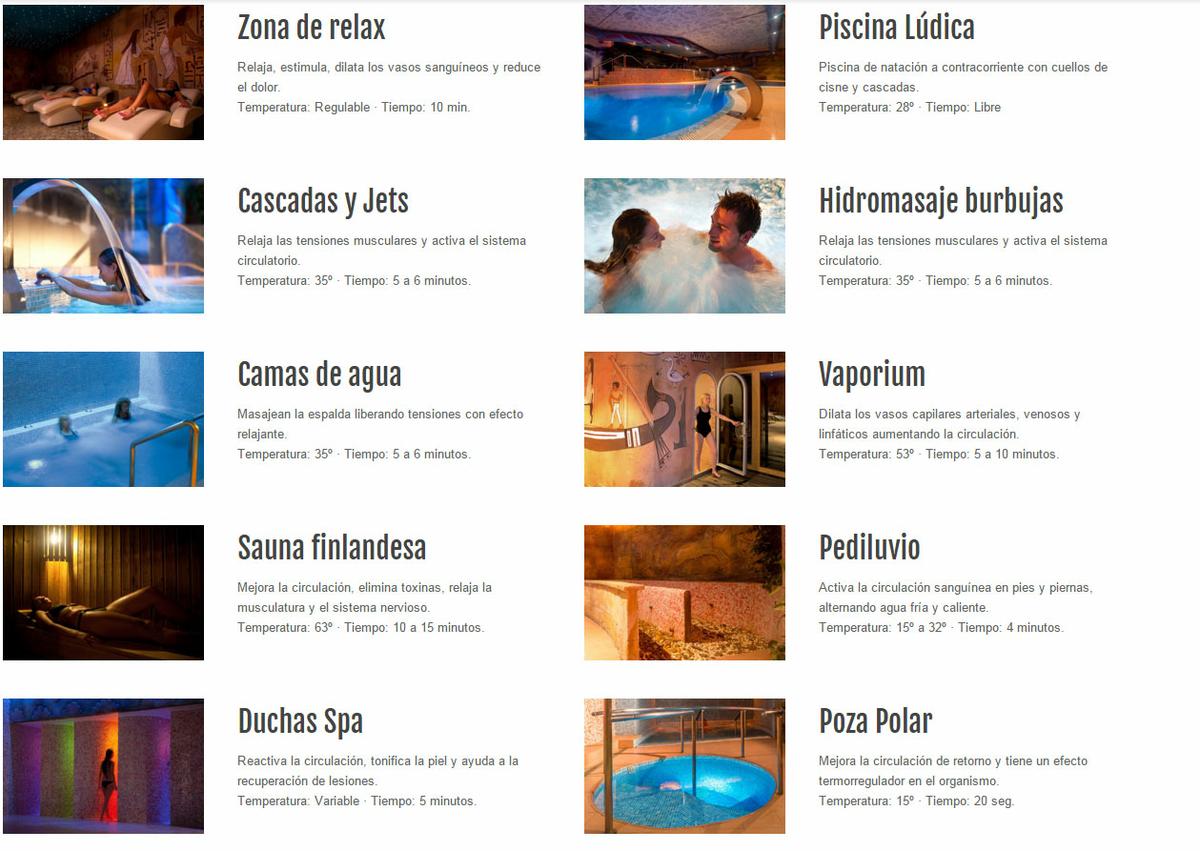 El spa de adultos es muy completo. Tiene piscina lúdica, chorros, vaporium, pediluvio y mucho más. A la entrada tienes un plano donde te recomienda el recorrido a realizar entre las diferentes zonas y el tiempo aconsejado que debes permanecer en cada una de ellas.