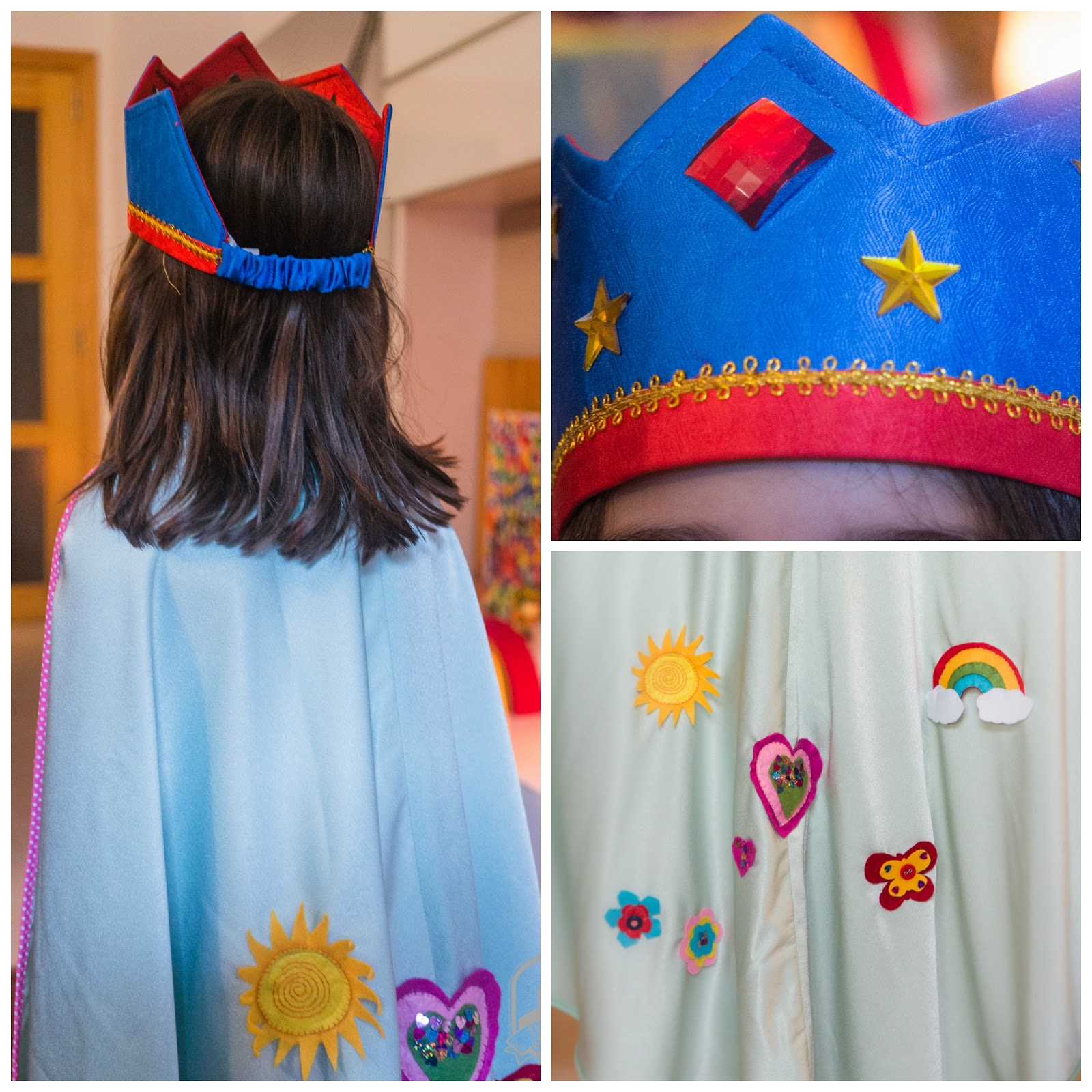 La primera sorpresa fue que la ropa doblada en la silla se había transformado en su capa de cumpleaños y una corona. (Puedes ver cómo hice la capa de cumpleaños y qué sentido tiene), que por supuesto quiso ponerse en cuanto las vio.