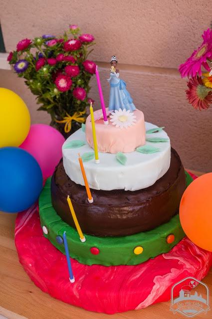 Tengo que decir que Sunflower lleva desde enero diciéndome que para su cumpleaños quería una tarta de cinco pisos, cada piso de un color, con una vela en cada uno, y arriba del todo una princesa. ¡Pues sí! Y esta fue la tarta que hicimos (ayudadas claro de algunas placas de porexpan compradas en una tienda multiprecio, la verdadera tarta es la de chocolate). Ella me ayudó con el fondant, y la verdad no se nos da muy bien, pero estuvo muy contenta con el resultado, y se le ocurrió decorarla también con globos, y por supuesto, la princesa la escogió ella.