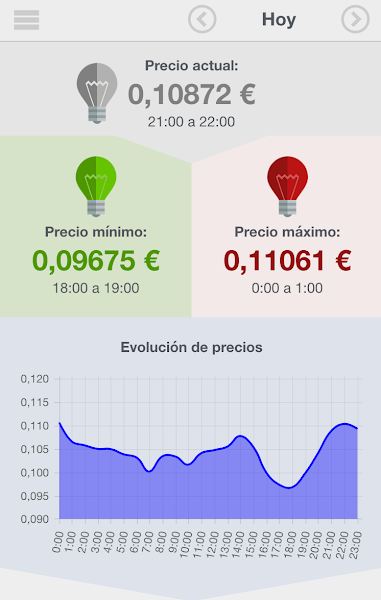 3.- Instalarte una APP en tu teléfono móvil. Hay varias, dependiendo si tu smarthphone es IOS o Android. Pero, en cualquier caso, son muy parecidas. Yo, particularmente, tengo una que se llama Precio Luz APP pero como esa, ya te digo que hay muchas y con el mismo funcionamiento. A las 9 de la noche del día anterior te avisa del precio máximo y el mínimo del día siguiente y te muestra un gráfico para que tú te organices. Particularmente, hoy la diferencia entre el máximo y el mínimo es pequeña (cómo se nota la ley de la oferta y la demanda y que hoy volveremos a tener el aire acondicionado a todo trapo). Pero por muy pequeña que sea la diferencia, eso que nos ahorramos. Y ya se sabe, muchos granos de arena hacen una montaña.