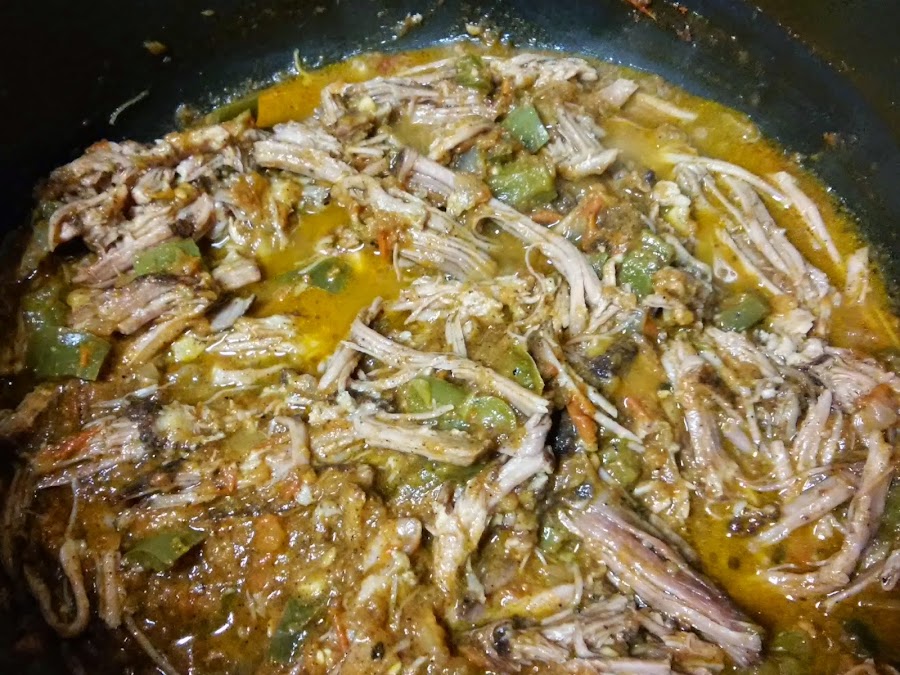 Devuelve el puerco a la olla. Cocina a fuego medio por 4-6 minutos o hasta que las verduras hiervan. Tapa la olla y metela al horno. Volteandolo cada 45 minutos, hornea el puerco por 2 1/2 horas o hasta que se pueda deshacer facilmente con un tenedor. Saca el puerco de la olla; separalo con un tenedor. Regresalo al sarten y revuelvelo con el guisado.
