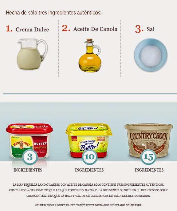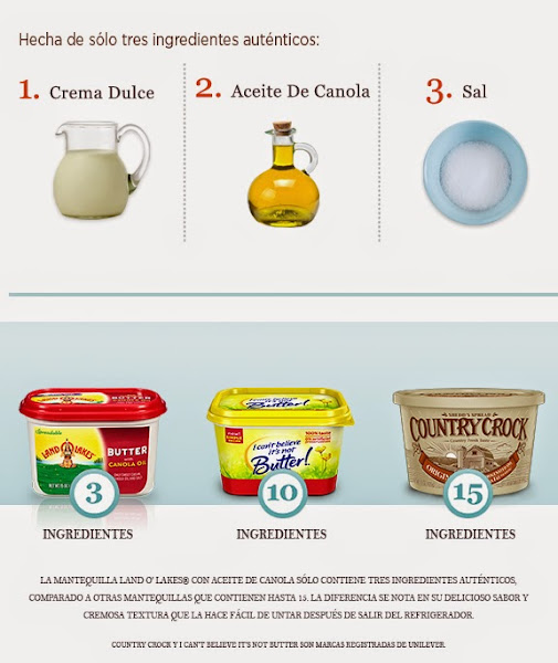 A quien no le ha pasado que cuando estamos en el super solo comparamos los precios y nadamas? Como mama me interesa llevar a casa productos saludables y sin tantos ingredientes, pero aveces con tanto ruido no logro enfocarme bien en los hasta 15 ingredientes que algunos contienen (algunos ingredientes ni los puedo pronunciar!) y termino comprando el que sea. Por eso estoy agradecida de haber sido contactada por Land O" Lakes, ahora si se que hay en mi margarina! Y es que es sencillo, la mantequilla de Land O? Lakes® con Aceite de Canola solo contiene 3 ingredientes: crema dulce, aceite de canola y sal asi de simple y sencillo. Nada artificial, son ingredientes que puedo pronunciar y se lo que son. Estos tres ingredientes resultan en una mantequilla con una textura cremosa y deliciosa.