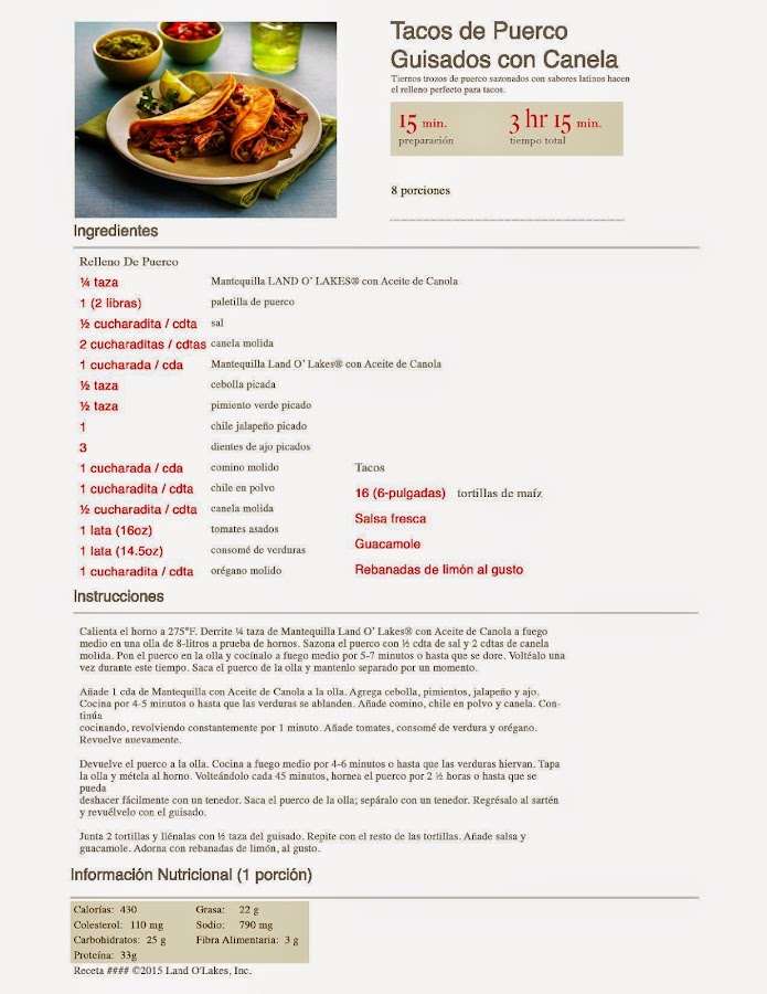 Sabes cuantos ingredientes hay en tu margarina? Bueno yo tampoco, hasta que comenze a usar la mantequilla de Land O? Lakes® con Aceite de Canola, sigue leyendo para que te enteres de que hay en mi margarina. Y ten lapiz y papel ala mano porque hoy me gustaria compartir contigo la receta de unos ricos tacos de puerco usando la mantequilla de Land O" Lakes® con Aceite de Canola y con un ingrediente que talvez no pensabas podria ser posible, canela. Si, canela! Se me hizo un poco extraño sazonar con canela la carne pero te prometo que el sabor que le da es unico.
