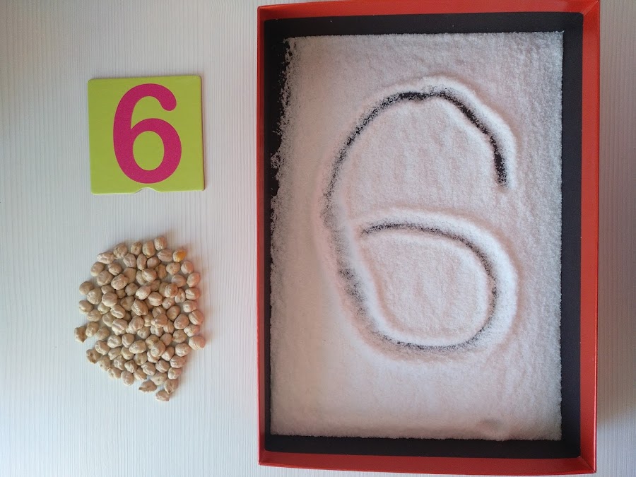 Después, pueden empezar a escribir los números en bandejas sensoriales: arena, sal, harina, arroz, lentejas,...ya que es otro instrumento que involucra el sentido del tacto y que suele encantar a los niños/as.