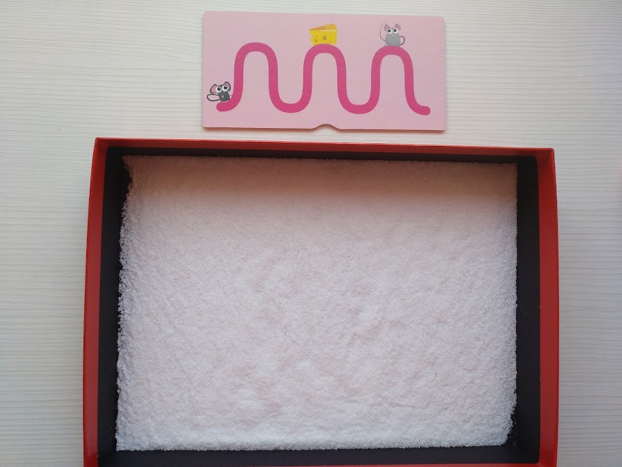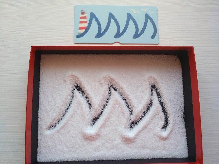 Después de seguir con los dedos la línea del trazo, el siguiente paso es tener una bandeja sensorial para trazarlo, y que así se perfeccione y mejore el aprendizaje.