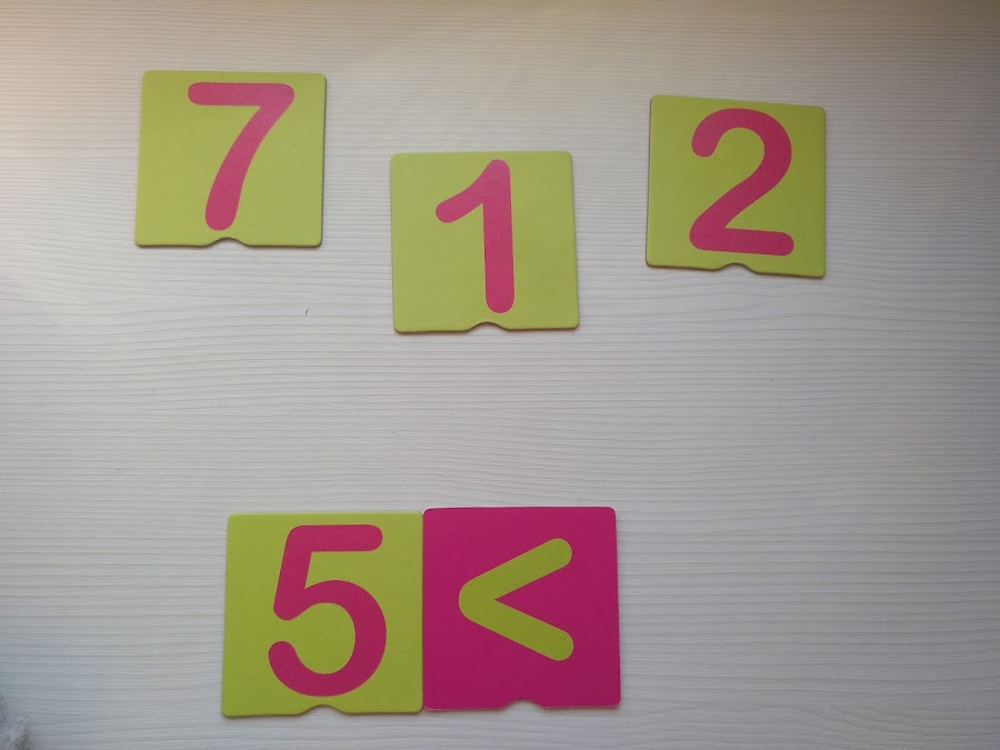 - Colocamos el signo que queramos, el de menor que o el de mayor que, y pedimos al niño/a que coloque a cada lado del signo dos números. Por ejemplo 2 < 5 o 7 > 3