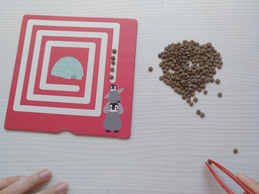 Para reforzar cada uno de los recorridos, podemos colocar en la superficie rugosa diversos elementos formando el recorrido. Para ello podemos utilizar las manos, o una pinza, de esta forma también reforzamos la psicomotricidad fina y el agarre en pinza.