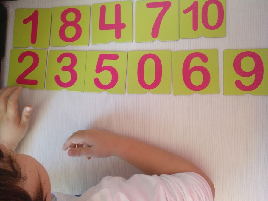 Se colocan los números en la mesa al azar y el niño/a los ordena del 0 al 10, en orden, ascendente o descendente según se indique. De esta forma estamos trabajando la secuencia numérica. Así, también se refuerza el nombre de los números (uno, dos, tres…).