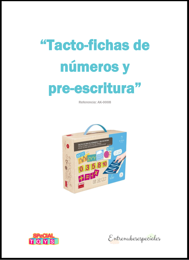 Se compone de 23 Tacto-fichas(46 modelos) de pre-escritura de números, signos matemáticos y de diferentes trazos. Las fichas son de cartón duro muy resistente, duradero y de una calidad impecable. Todas las fichas tienen una superficie rugosa para favorecer la estimulación táctil o háptica, y están impresas por ambas caras. Por otro lado, está inspirado en la metodología Montessori, todas las fichas tiene una muesca en la parte inferir que permite a los niños/as posicionarlas correctamente y jugar con autonomía.