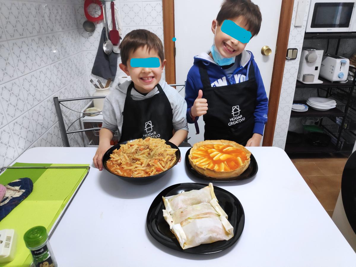 El menú lo elegimos entre todos. El hijo pequeño eligió macarrones con salsa boloñesa de primero. El mayor tarta de manzana de postre. Y yo les propuse salmón en papillote de segundo.