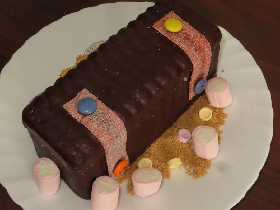 El bizcocho puede ser comprado o elaborado en casa, yo como iba un poco pillada de tiempo lo compré, pero aquí os dejo esta deliciosa receta de bizcocho de chocolate casero que está para chuparse los dedos: http://lacucharaenlamaleta.blogspot.com/2017/03/tarta-pez-de-lacasitos.html. Por supuesto, compráis un bizcocho con forma de cofre o si lo hacéis en casa intentáis asemejar la forma.