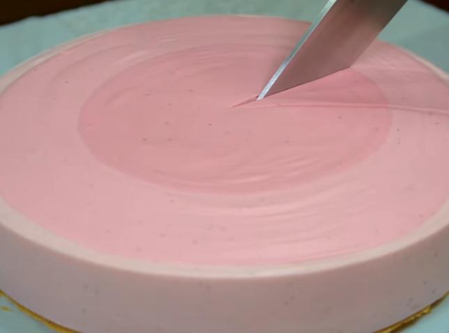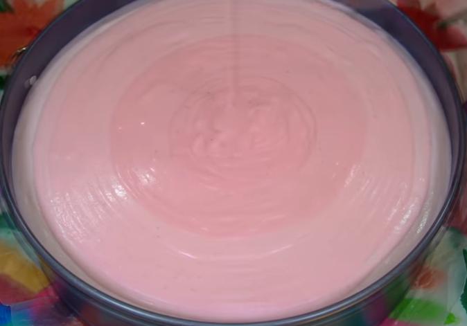 Sacamos el molde con la base de galleta del frigorífico y volcamos con cuidado la mezcla de nuestra tarta de cumpleaños de fresa.