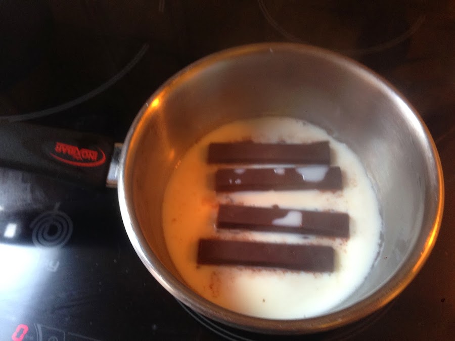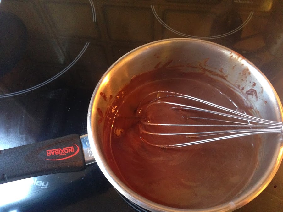 Una vez que el flan haya enfriado como os decía antes, hacemos la cobertura, yo lo hago en un cazo con un poco de leche y le voy echando las barritas poco a poco sin parar de remover.